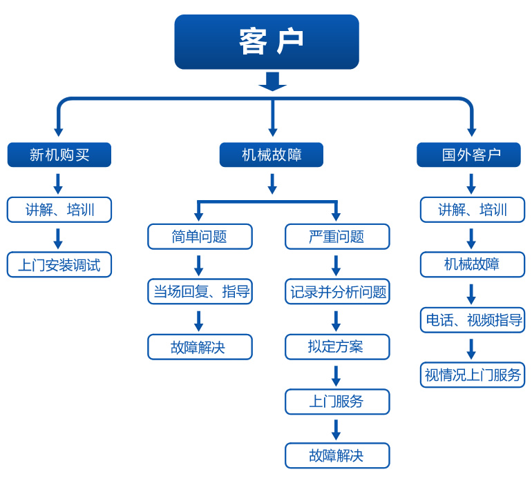 我們嚴格執(zhí)行《售后服務承諾書》,我們深信優(yōu)質(zhì)、系統(tǒng)、全面、快捷的服務是事業(yè)發(fā)展的基礎。 經(jīng)過多年的不斷探索和進取,我們形成了"以客戶為核心、以質(zhì)量為企業(yè)的第一生命"的服務理念。 并以嚴格的管理、先進的技術(shù)創(chuàng)建國內(nèi)一流的服務企業(yè)為目標,制定了"規(guī)范管理制度,嚴格過程控制,保證產(chǎn)品質(zhì)量,達到顧客滿意"的質(zhì)量方針,堅持"用戶第一"的原則,構(gòu)建良好的銷售服務體系,為客戶提供優(yōu)質(zhì)的售前、售中及售后服務。 服務宗旨:快速、果斷、準確、周到、徹底 服務目標:服務質(zhì)量贏得用戶滿意 服務效率:保修期內(nèi)或保修期外如設備出現(xiàn)故障,供方在接到通知后,維修人員在24小時內(nèi)可達到現(xiàn)場并開始維修。 服務原則:產(chǎn)品保修期為12個月,在保修期內(nèi)供方將免費維修和更換屬質(zhì)量原因造成的零部件損壞保修期外零部件的損壞,提供的配件只收成本費,由需方人為因素造成的設備損壞,供方維修或提供的配件均按成本價計。 在安裝后機器能正常的運行起來,我公司技術(shù)人員將對機器進行性能優(yōu)化和穩(wěn)定性方面的調(diào)試以確定機器的質(zhì)量是否能達到用戶的要求和需要。在調(diào)試時我公司技術(shù)人員必須耐心的向用戶解釋和指導,確保用戶能基本理解機器正常運行的操作知識及對機器穩(wěn)定運行的基本調(diào)試。